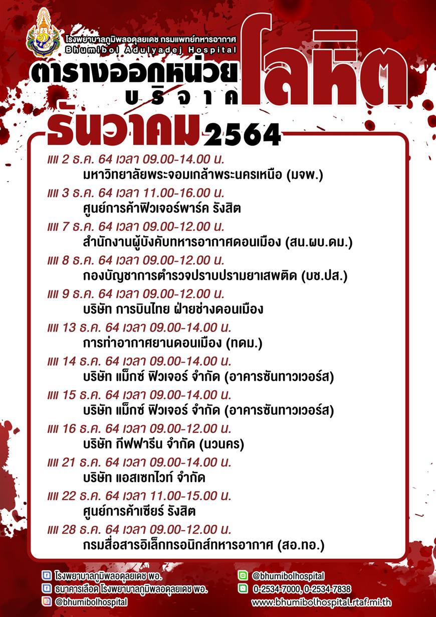 กำหนดการรับบริจาคโลหิตกับหน่วยเคลื่อนที่ธนาคารเลือดเดือนธันวาคม